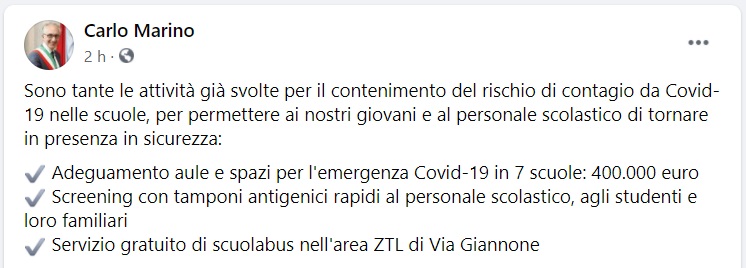 Questo quanto pubblicato sulla pagina fb del Sindaco Marino: "Sono tante le attività già svolte per il contenimento del rischio di contagio da Covid-19 nelle scuole - si legge nella nota -, per permettere ai nostri giovani e al personale scolastico di tornare in presenza in sicurezza: Adeguamento aule e spazi per l'emergenza Covid-19 in 7 scuole: 400.000 euro, Screening con tamponi antigenici rapidi al personale scolastico - si legge nella nota -, agli studenti e loro familiari, Servizio gratuito di scuolabus nell'area ZTL di Via Giannone"