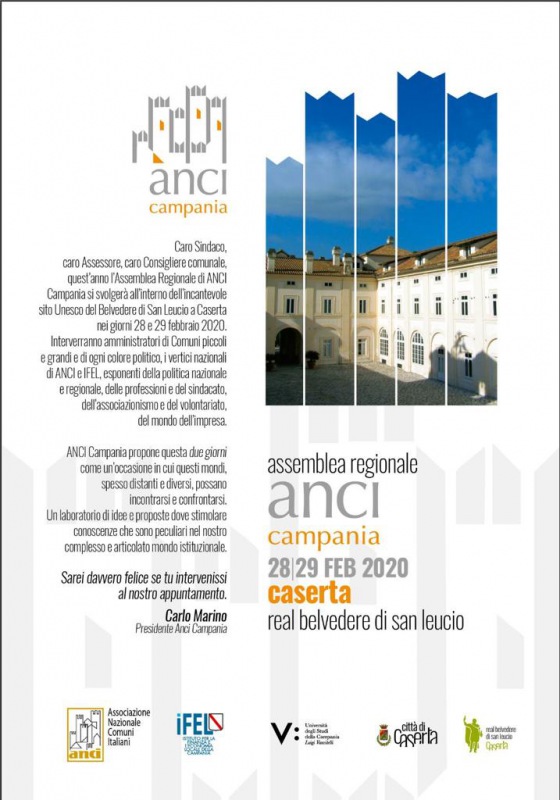 "ANCI Campania ha dato il via alla sua Assemblea Regionale che si terrà nello splendido scenario del Belvedere di San Leucio a Caserta il 28 e 29 febbraio 2020. -spiega la nota-Sarà un importante appuntamento associativo e istituzionale al quale interverranno oltre 500 sindaci, I vertici nazionali di ANCI e IFEL, -spiega la nota-importanti personalità del mondo delle istituzioni, delle professioni, del sindacato e del terzo settore. Una due giorni per avvicinare tutti questi mondi, ma anche per incontrarsi, conoscersi e confrontarsi."