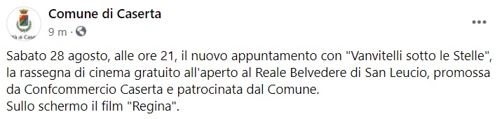Questo quanto apprendiamo dalla pagina fb del Comune di Caserta: "Sabato 28 agosto, alle ore 21, il nuovo appuntamento con "Vanvitelli sotto le Stelle", la rassegna di cinema gratuito all'aperto al Reale Belvedere di San Leucio, promossa da Confcommercio Caserta e patrocinata dal Comune. Sullo schermo il film "Regina"."