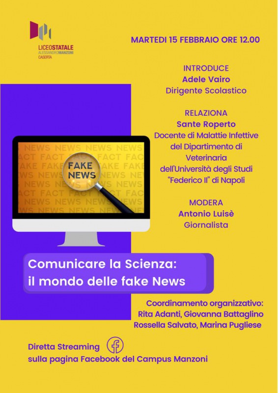 «Comunicare la scienza: il mondo delle fake news». È questo il titolo dell’incontro di martedì 15 febbraio che si terrà alle ore 12 nell’aula magna del liceo Manzoni di Caserta e in streaming sui canali social del Campus Manzoni. La Dirigente Scolastica dell’istituto, Adele Vairo, introdurrà la relazione di Sante Roperto, docente di Malattie Infettive del Dipartimento di Veterinaria dell’Università degli Studi di Napoli “Federico II”. L’incontro- si legge nella nota- sarà moderato dal giornalista Antonio Luisè. «Le fake news sulla salute sono le terze più diffuse al mondo – ha spiegato il docente Sante Roperto - Ma più che in altri casi possono creare psicosi e allarmismi. Come nascono? Perché diventano virali? In che modo vanno veicolate in maniera corretta per tutelare la salute pubblica e distinguerle dalle fake news? Queste e tante altre domande saranno al centro del dibattito organizzato al liceo Manzoni. Domande a cui mai come negli ultimi anni è necessario dare risposte per riuscire a riconoscere le notizie vere e a diffidare da quelle false». «Quello delle fake news – ha commentato la Dirigente del liceo Manzoni, Adele Vairo – è un problema di portata mondiale che anno dopo anno ha contribuito ad alimentare incertezze nei cittadini. La mole di informazioni che viaggia sul web è tale che riconoscere le notizie vere da quelle false diventa ogni giorno più difficile. Occorre un lavoro approfondito di ricerca. Con il Covid-19 il fenomeno delle fake news è cresciuto in modo apicale, finendo per confondere i cittadini anche sulle tecniche scientifiche messe in campo dai virologi e dagli scienziati. Proprio per questo – ha concluso Vairo – sono particolarmente grata al professore Roperto per la sua partecipazione e- si legge nella nota- per un intervento diretto proprio a sgomberare il campo a quella che soprattutto in campo scientifico deve essere una comunicazione sana e responsabile». L’incontro di martedì è stato organizzato con il coordinamento dei docenti Rita Adanti, Giovanna Battaglino, Rossella Salvato e Marina Pugliese."