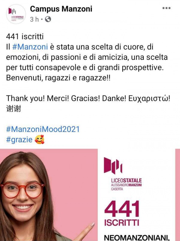 Ancora un successo per il Liceo Manzoni, che nonostante la pandemia e le visite all'istituto effettuate o online oppure su prenotazione ha raggiunto il considerevole numero di ben 441 nuovi iscritti. "Il Manzoni è stata una scelta di cuore, di emozioni, di passioni e di amicizia - si legge nella nota -, una scelta per tutti consapevole e di grandi prospettive. Benvenuti, ragazzi e ragazze!!".