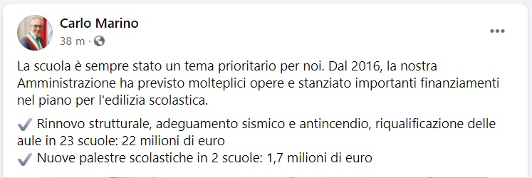 Questo quanto pubblicato sulla pagina fb del Sindaco Marino: "La scuola è sempre stato un tema prioritario per noi. Dal 2016 - si legge nella nota -, la nostra Amministrazione ha previsto molteplici opere e stanziato importanti finanziamenti nel piano per l'edilizia scolastica. Rinnovo strutturale - si legge nella nota -, adeguamento sismico e antincendio, riqualificazione delle aule in 23 scuole: 22 milioni di euro. Nuove palestre scolastiche in 2 scuole: 1,7 milioni di euro"
