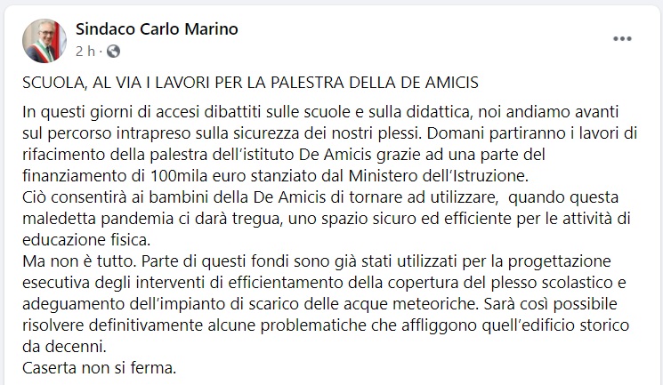 CE. SCUOLA. Marino: "Al via i lavori per la palestra della De Amicis"