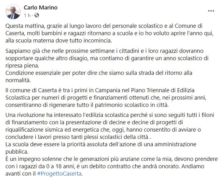 Questo quanto pubblicato sulla pagina fb del Sindaco Marino: "Questa mattina, grazie al lungo lavoro del personale scolastico e al Comune di Caserta, molti bambini e ragazzi ritornano a scuola e io ho voluto aprire l'anno qui, alla scuola materna dove tutto incomincia. Sappiamo già che nelle prossime settimane i cittadini e i loro ragazzi dovranno sopportare qualche altro disagio - si legge nella nota -, ma contiamo di garantire un anno scolastico di ripresa piena. Condizione essenziale per poter dire che siamo sulla strada del ritorno alla normalità. Il comune di Caserta è tra i primi in Campania nel Piano Triennale di Edilizia Scolastica per numeri di progetti e finanziamenti ottenuti che, nei prossimi anni, consentiranno di rigenerare tutto il patrimonio scolastico in città. Una rivoluzione ha interessato l’edilizia scolastica perché si sono seguiti tutti i filoni di finanziamento con la presentazione di decine e decine di progetti di riqualificazione sismica ed energetica che, oggi, hanno consentito di avviare o concludere i lavori presso tanti plessi scolastici della città. La scuola deve essere la priorità assoluta dell’azione di una amministrazione pubblica - si legge nella nota -. È un impegno solenne che le generazioni più anziane come la mia, devono prendere con i ragazzi da 0 a 18 anni, è un debito contratto che andrà onorato. Andiamo avanti con il Progetto Caserta."