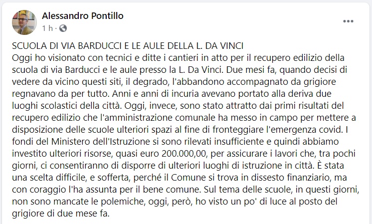 Questo quanto pubblicato dall'Assessore Pontillo sulla sua pagina Facebook