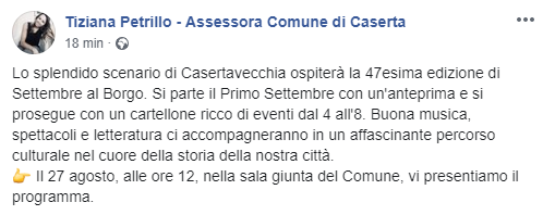 Questo il post pubblicato su Facebook dall'assessore del Comune di Caserta Tiziana Petrillo: