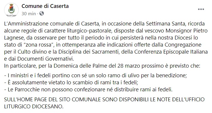 "L’Amministrazione comunale di Caserta, in occasione della Settimana Santa, ricorda alcune regole di carattere liturgico-pastorale, disposte dal vescovo Monsignor Pietro Lagnese, da osservare per tutto il periodo in cui persisterà nella nostra Diocesi lo stato di “zona rossa”, in ottemperanza alle indicazioni offerte dalla Congregazione per il Culto divino e la Disciplina dei Sacramenti, della Conferenza Episcopale Italiana e dai Documenti Governativi. -Si legge nella nota- In particolare, per la Domenica delle Palme del 28 marzo prossimo è previsto che: - I ministri e i fedeli portino con sé un solo ramo di ulivo per la benedizione; - È assolutamente vietato lo scambio di rami tra i fedeli; - Le Parrocchie non possono confezionare né distribuire rami ai fedeli. SULL'HOME PAGE DEL SITO COMUNALE SONO DISPONIBILI LE NOTE DELL'UFFICIO LITURGICO DIOCESANO."