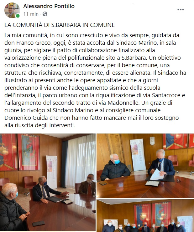 "La mia comunità, in cui sono cresciuto e vivo da sempre, guidata da don Franco Greco, oggi, è stata accolta dal Sindaco Marino, in sala giunta, per siglare il patto di collaborazione finalizzato alla valorizzazione piena del polifunzionale sito a S.Barbara. -Si legge nella nota- Un obiettivo condiviso che consentirà di conservare, per il bene comune, una struttura che rischiava, concretamente, di essere alienata. Il Sindaco ha illustrato ai presenti anche le opere appaltate e che a giorni prenderanno il via come l'adeguamento sismico della scuola dell'infanzia, il parco urbano con la riqualificazione di via Santacroce e l'allargamento del secondo tratto di via Madonnelle. -Si legge nella nota- Un grazie di cuore lo rivolgo al Sindaco Marino e al consigliere comunale Domenico Guida che non hanno fatto mancare mai il loro sostegno alla riuscita degli interventi."