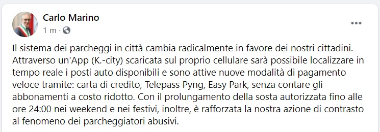 Questo quanto apprendiamo dalla pagina fb del Sindaco Marino: "Il sistema dei parcheggi in città cambia radicalmente in favore dei nostri cittadini. Attraverso un'App (K.-city) scaricata sul proprio cellulare - si legge nella nota - sarà possibile localizzare in tempo reale i posti auto disponibili e sono attive nuove modalità di pagamento veloce tramite: carta di credito, Telepass Pyng, Easy Park, senza contare gli abbonamenti a costo ridotto. Con il prolungamento della sosta autorizzata fino alle ore 24:00 nei weekend e nei festivi, inoltre - si legge nella nota -, è rafforzata la nostra azione di contrasto al fenomeno dei parcheggiatori abusivi."
