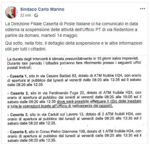 Lo apprendiamo dalla pagina Facebook del Sindaco Carlo Marino