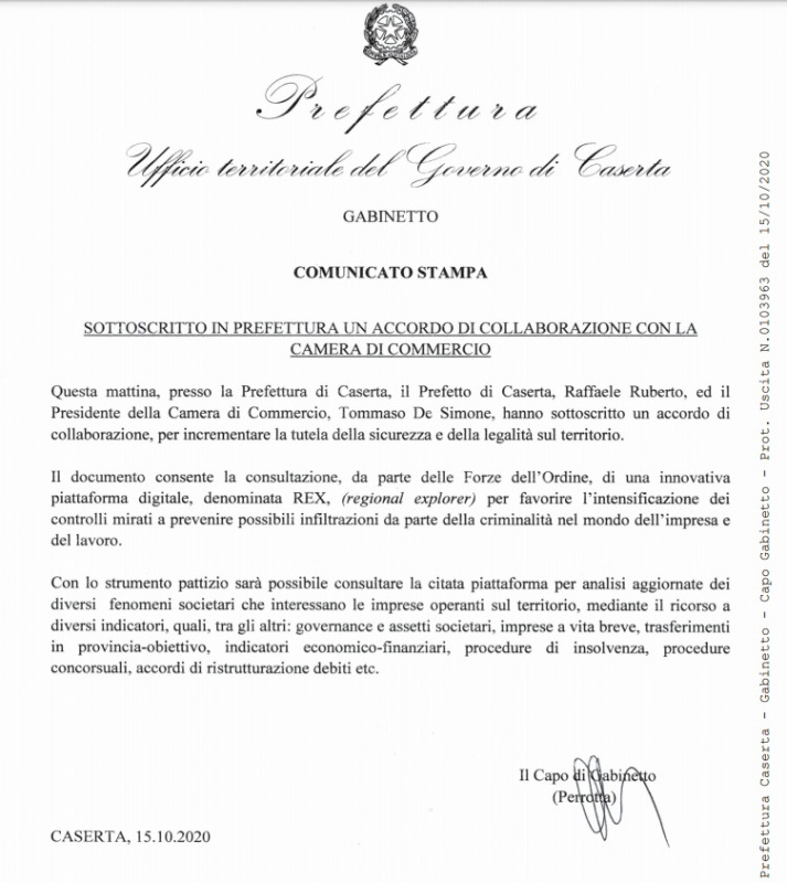 Pubblichiamo nota stampa della Prefettura di Caserta