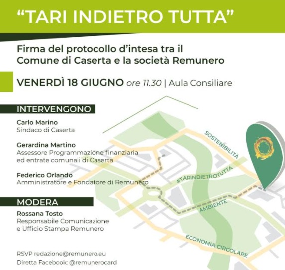 Pubblichiamo questa nota stampa: "Il 18 giugno alle ore 11.30 presso l'Aula Consiliare del Comune di Caserta vi sarà la conferenza stampa di presentazione del "protocollo d'intesa" tra l'Amministrazione Comunale e Remunero in relazione al quale, prossimamente - si legge nella nota -, i cittadini e le imprese del territorio riceveranno la restituzione del 100% della TARI. Remunero è una start up innovativa impegnata in progetti di sviluppo economico per il miglioramento della qualità ambientale e di economia circolare sul territorio, attraverso la restituzione del 100% della TARI a famiglie e imprese e nei Comuni che si adeguano ai parametri indicati dall'Unione Europea per ridurre la produzione di rifiuti e ridurre le emissioni di CO2. Alla conferenza stampa - si legge nella nota - saranno presenti: Carlo Marino Sindaco di Caserta, Gerardina Martino Assessore Programmazione finanziaria ed entrate comunali di Caserta, Federico Orlando Amministratore e Fondatore di Remunero. Modera Rossana Tosto Responsabile Comunicazione e Ufficio Stampa Remunero".