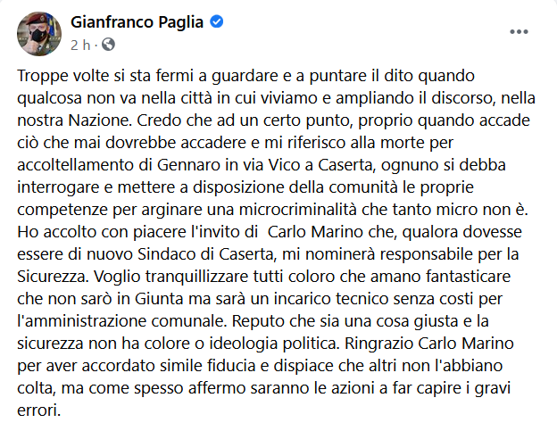 Questo il post pubblicato sulla pagina Facebook del Tenente Colonnello, medaglia d'oro al valore militare, Gianfranco Paglia: "Troppe volte si sta fermi a guardare e a puntare il dito quando qualcosa non va nella città in cui viviamo e ampliando il discorso, nella nostra Nazione. Credo che ad un certo punto, proprio quando accade ciò che mai dovrebbe accadere e mi riferisco alla morte per accoltellamento di Gennaro in via Vico a Caserta, ognuno si debba interrogare e mettere a disposizione della comunità le proprie competenze per arginare una microcriminalità che tanto micro non è. Ho accolto - dice nel post - con piacere l'invito di Carlo Marino che, qualora dovesse essere di nuovo Sindaco di Caserta, mi nominerà responsabile per la Sicurezza. Voglio tranquillizzare tutti coloro che amano fantasticare che non sarò in Giunta ma sarà un incarico tecnico senza costi per l'amministrazione comunale. Reputo che sia una cosa giusta e la sicurezza non ha colore o ideologia politica. Ringrazio Carlo Marino per aver accordato simile fiducia e dispiace che altri non l'abbiano colta, ma come spesso affermo saranno le azioni a far capire i gravi errori - chiosa".