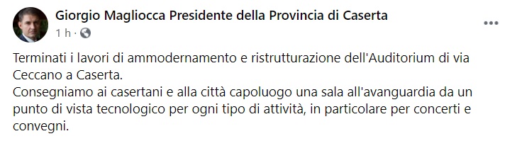 "Terminati i lavori di ammodernamento e ristrutturazione dell'Auditorium di via Ceccano a Caserta. -Si legge nella nota- Consegniamo ai casertani e alla città capoluogo una sala all'avanguardia da un punto di vista tecnologico per ogni tipo di attività, in particolare per concerti e convegni."