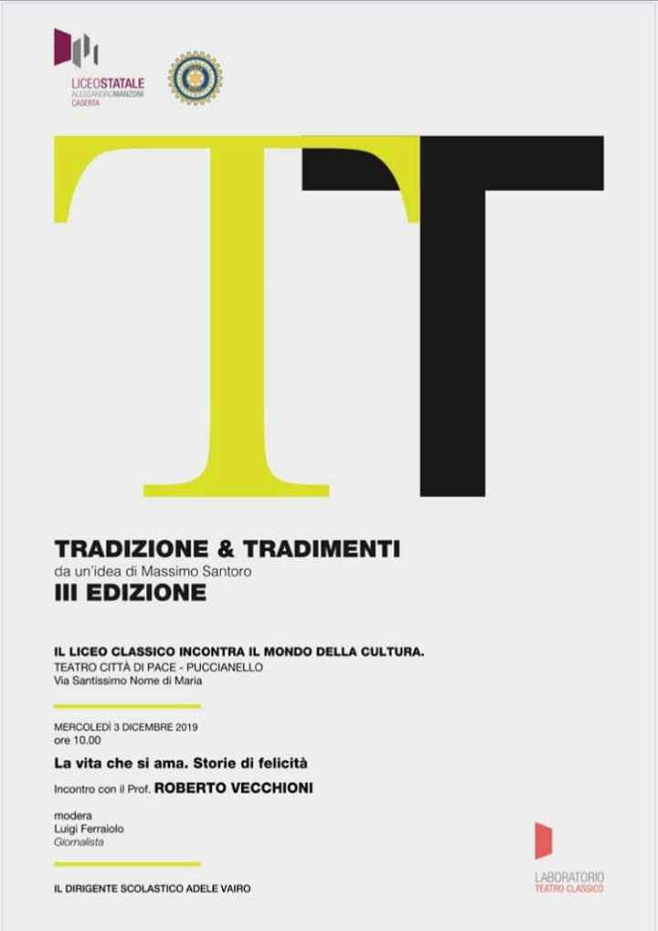 Mercoledì 3 dicembre, alle ore 10.00, presso il Teatro Città di Pace di Puccianiello, in via Santissimo Nome di Maria, si terrà la III edizione di "Tradizione & Tradimenti", da un'idea di Massimo Santoro, in cui il Liceo Classico del Manzoni incontrerà il mondo della cultura. La nuova edizione verterà su "La vita che si ama. Storie di felicità" e prevederà un incontro con il Prof. Roberto Vecchioni, con la moderazione del giornalista Luigi Ferraiolo.
