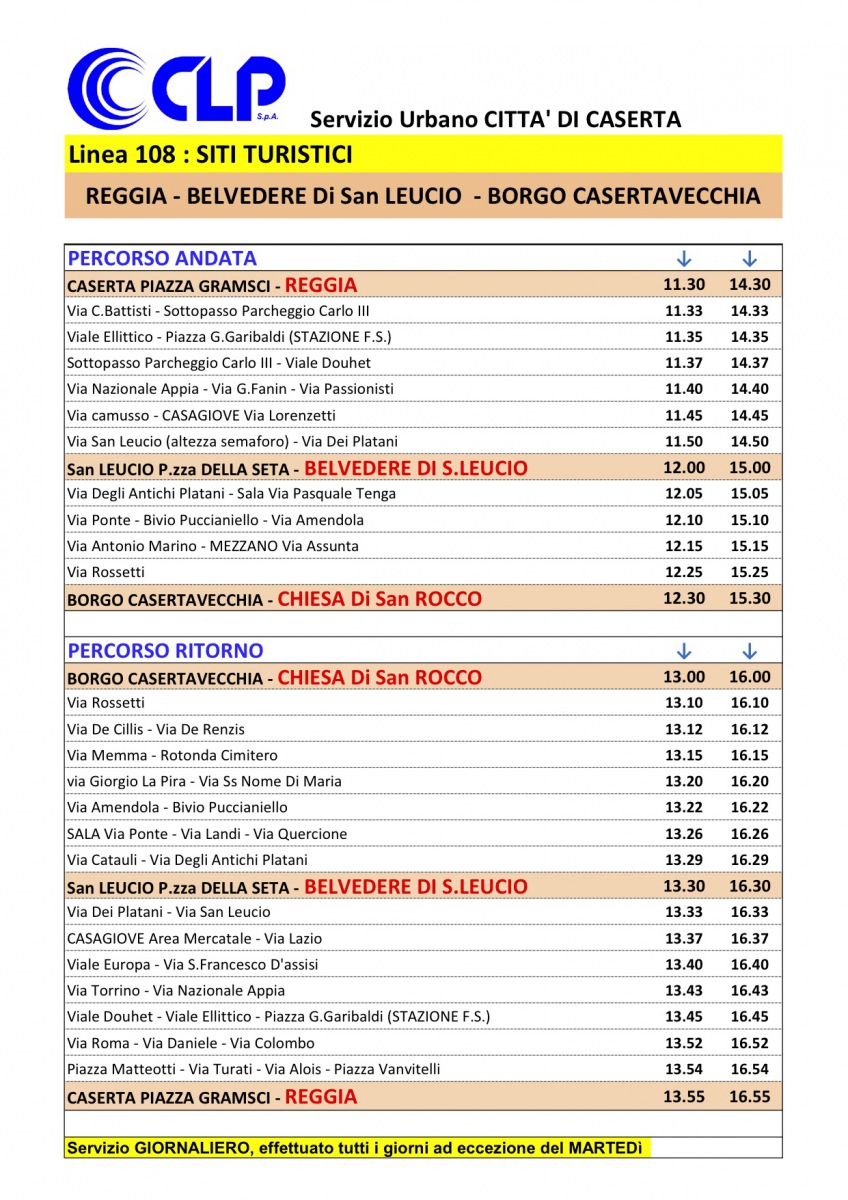 "Siti turistici, prenderanno il via venerdì 1 marzo le corse dei bus della linea 108 del trasporto pubblico locale, assicurato a Caserta dalla Clp.