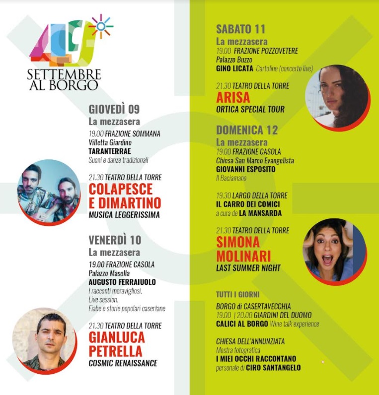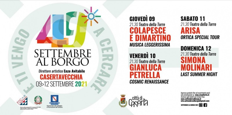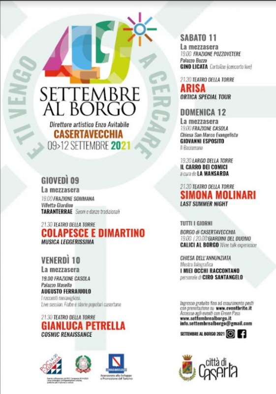 Pubblichiamo questa nota stampa sul Settembe al borgo: "SETTEMBRE AL BORGO 49esima edizione – dal 9 al 12 settembre 2021 Direzione artistica Enzo Avitabile E ti vengo a cercare