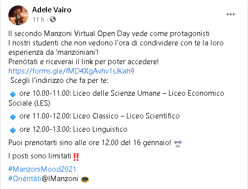 Lo apprendiamo dalla bacheca Facebook di Adele Vairo, Dirigente Scolastico del Liceo Manzoni di Caserta.