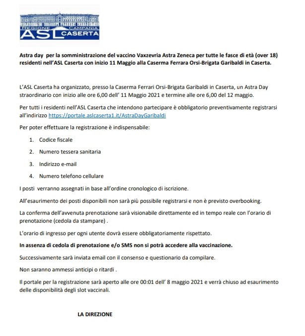 L'ASL Caserta fa sapere che in occasione dell'11 maggio vi sarà l'Astraday, la somministrazione del vaccino Astazeneca aperta a tutte le fasce d'età presso la Caserma Ferrara Orsi-Brigata Garibaldi di Caserta. Di seguito tutti i dettagli. CLICCA QUI per prenotarti