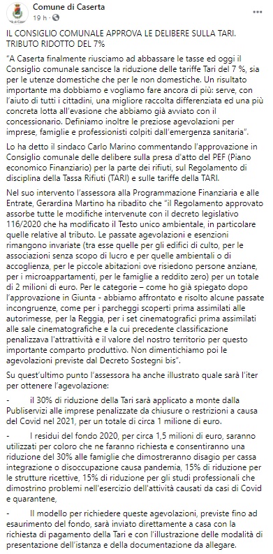 Questo quanto apprendiamo dalla pagina facebook del Comune di Caserta: