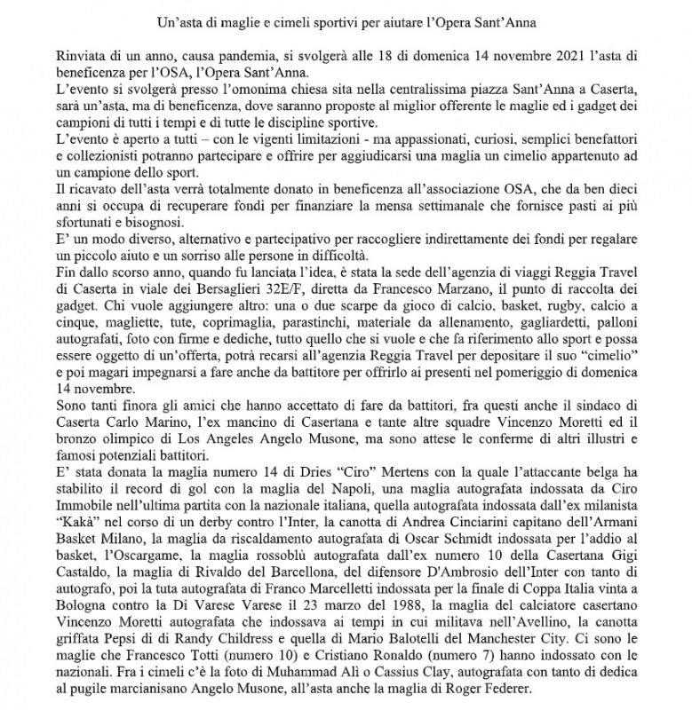 "Un’asta di maglie e cimeli sportivi per aiutare l’Opera Sant’Anna. Rinviata di un anno, causa pandemia, si svolgerà alle 18 di domenica 14 novembre 2021 l’asta di beneficenza per l’OSA, l’Opera Sant’Anna. L’evento si svolgerà presso l’omonima chiesa sita nella centralissima piazza Sant’Anna a Caserta, sarà un’asta, ma di beneficenza, dove saranno proposte al miglior offerente- si legge nella nota- le maglie ed i gadget dei campioni di tutti i tempi e di tutte le discipline sportive. L’evento è aperto a tutti – con le vigenti limitazioni - ma appassionati, curiosi, semplici benefattori e collezionisti potranno partecipare e offrire per aggiudicarsi una maglia un cimelio appartenuto ad un campione dello sport. Il ricavato dell’asta verrà totalmente donato in beneficenza all’associazione OSA, che da ben dieci anni si occupa di recuperare fondi per finanziare la mensa settimanale che fornisce pasti ai più sfortunati e bisognosi. E’ un modo diverso, alternativo e partecipativo per raccogliere indirettamente dei fondi per regalare un piccolo aiuto e un sorriso alle persone in difficoltà. Fin dallo scorso anno, quando fu lanciata l’idea, è stata la sede dell’agenzia di viaggi Reggia Travel di Caserta in viale dei Bersaglieri 32E/F, diretta da Francesco Marzano, il punto di raccolta dei gadget. Chi vuole aggiungere altro: una o due scarpe da gioco di calcio, basket, rugby, calcio a cinque, magliette, tute, coprimaglia, parastinchi, materiale da allenamento, gagliardetti, palloni autografati, foto con firme e dediche, tutto quello che si vuole e che fa riferimento allo sport e possa essere oggetto di un’offerta, potrà recarsi all’agenzia Reggia Travel per depositare il suo “cimelio” e poi magari impegnarsi a fare anche da battitore per offrirlo ai presenti nel pomeriggio di domenica 14 novembre. Sono tanti finora gli amici che hanno accettato di fare da battitori, fra questi anche il sindaco di Caserta Carlo Marino, l’ex mancino di Casertana e tante altre squadre Vincenzo Moretti ed il bronzo olimpico di Los Angeles Angelo Musone, ma sono attese le conferme di altri illustri e famosi potenziali battitori. E’ stata donata la maglia numero 14 di Dries “Ciro” Mertens con la quale l’attaccante belga ha stabilito il record di gol con la maglia del Napoli, una maglia autografata indossata da Ciro Immobile nell’ultima partita con la nazionale italiana, quella autografata indossata dall’ex milanista “Kakà” nel corso di un derby contro l’Inter, la canotta di Andrea Cinciarini capitano dell’Armani Basket Milano, la maglia da riscaldamento autografata di Oscar Schmidt indossata- si legge nella nota- per l’addio al basket, l’Oscargame, la maglia rossoblù autografata dall’ex numero 10 della Casertana Gigi Castaldo, la maglia di Rivaldo del Barcellona, del difensore D'Ambrosio dell’Inter con tanto di autografo, poi la tuta autografata di Franco Marcelletti indossata per la finale di Coppa Italia vinta a Bologna contro la Di Varese Varese il 23 marzo del 1988, la maglia del calciatore casertano Vincenzo Moretti autografata che indossava ai tempi in cui militava nell’Avellino, la canotta griffata Pepsi di di Randy Childress e quella di Mario Balotelli del Manchester City. Ci sono le maglie che Francesco Totti (numero 10) e Cristiano Ronaldo (numero 7) hanno indossato con le nazionali. Fra i cimeli c’è la foto di Muhammad Alì o Cassius Clay, autografata con tanto di dedica al pugile marcianisano Angelo Musone, all’asta anche la maglia di Roger Federer."