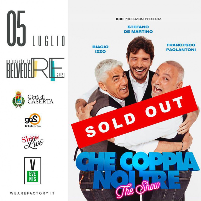 E' già sold-out lo spettacolo del prossimo 5 luglio, che rientra nel cartellone della manifestazione Un'estate da BelvedeRe, "Che coppia noi tre The show" che ha per protagonisti Stefano De Martino, Biagio Izzo e Francesco Paolantoni. Proprio per questo l'organizzazione ha già aperto la vendita dei biglietti in merito alla seconda data dello spettacolo per il 6 luglio. Questo a dimostrazione di come, in questo periodo estivo e con la pandemia da Covid che sembra lasci più respiro, i casertani e non solo hanno voglia di svagarsi e divertirsi. Ricordiamo che comunque è sempre importante rispetare le regole in materia di contrasto all'epidemia, come indossare la mascherina e mantenere la distanza.