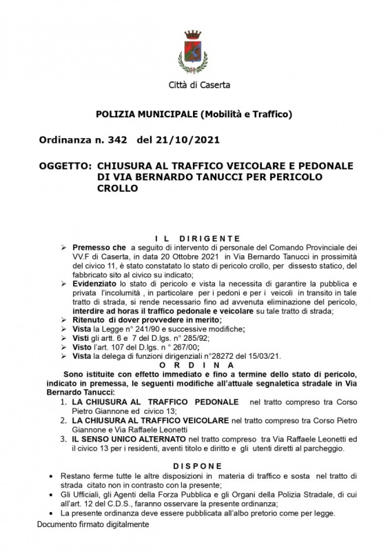 "URGENTI MODIFICHE SEGNALETICA STRADALE E CHIUSURA VIA TANUCCI PER PERICOLO CROLLO"