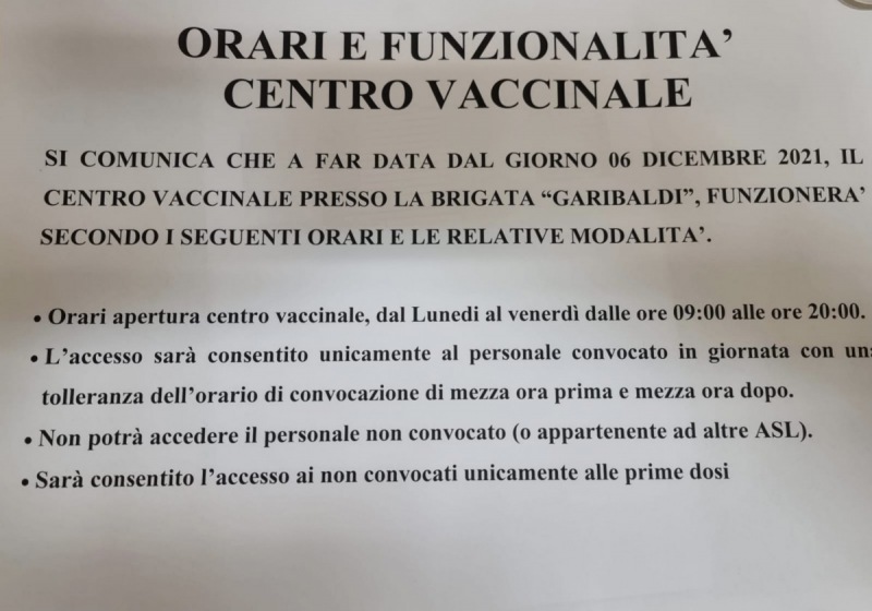 Pubblichiamo nota dell'Ufficio stampa Brigata Garibaldi di Caserta: "Comunicazione di servizio. Da Lunedì, in considerazione dell'aumentare dei vaccini prenotati per la 3a dose il centro presso la Brigata Garibaldi non sarà più aperto al pubblico se non nelle modalità riportate nell'allegato alla presente - si legge nella nota -. In buona sostanza abbiamo verificato che riprendendo i richiami e mantenendo aperto il centro a tutti diventava oneroso per la cittadinanza in termini di attesa e qualità del servizio, cosa a cui siamo stati sempre attenti. Per tanto abbiamo deciso con l'Asl e il Sindaco di Caserta di ritornare al sistema iniziale - si legge nella nota - dando la possibilità di accesso senza prenotazione solo a chi verrà a fare la prima dose. Il resto della popolazione se vorrà vaccinarsi in anticipo senza attendere la convocazione potrà farlo a Maddaloni, altro centro Esercito, o a Marcianise."