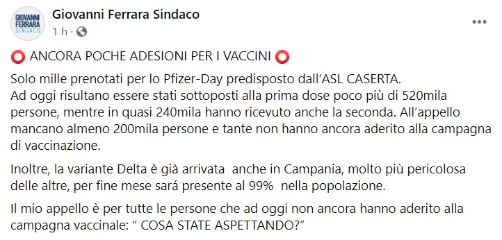 Questo quanto apprendiamo dalla pagina facebook del Sindaco di S.Felice a Cancello: "ANCORA POCHE ADESIONI PER I VACCINI Solo mille prenotati per lo Pfizer-Day predisposto dall’ASL CASERTA. Ad oggi risultano essere stati sottoposti alla prima dose poco più di 520mila persone, mentre in quasi 240mila hanno ricevuto anche la seconda. All’appello mancano almeno 200mila persone e tante non hanno ancora aderito alla campagna di vaccinazione. Inoltre, la variante Delta è già arrivata anche in Campania, molto più pericolosa delle altre, per fine mese sará presente al 99% nella popolazione. Il mio appello è per tutte le persone che ad oggi non ancora hanno aderito alla campagna vaccinale: “ COSA STATE ASPETTANDO?”"