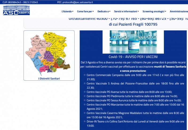 Questo quanto si apprende dal sito Asl Caserta: "Dal 3 Agosto e fino a diverso avviso sia per i richiami che per prime dosi è possibile recarsi - si legge - per i sottolencati Centri vaccinali per effettuare la vaccinazione muniti di Tessera Sanitaria e senza prenotazione: