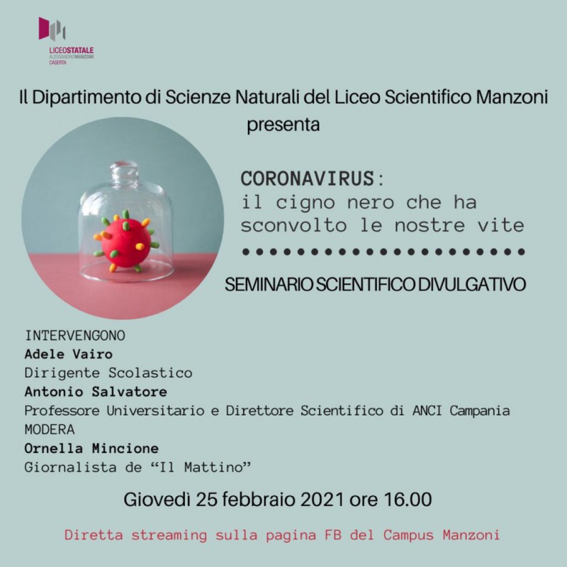 "Al Liceo “Manzoni” si torna a discutere di covid19: a parlarne con gli studenti e i docenti del noto Liceo casertano il Prof. Antonio Salvatore, Docente di Economia & Management Sanitario all'Università “Federico II” di Napoli, nonché Direttore Scientifico e-si legge nella nota- Responsabile dello “Sportello Salute” di ANCI Campania. Il webinar scientifico – dal suggestivo titolo Coronavirus: il cigno nero che ha sconvolto le nostre vite –, è stato organizzato dal Dipartimento di Scienze Naturali del Liceo Scientifico Manzoni; e si svolgerà giovedì 25 febbraio, alle ore 16.00, in live streaming sulla pagina Facebook Campus Manzoni, con-spiega la nota- la moderazione della Dott.ssa Ornella Mincione, giornalista de Il Mattino. Un appuntamento di grande interesse ed attualità quello voluto dal Liceo “Manzoni”, diretto dalla D.S Dott. Adele Vairo, -spiega la nota-da sempre attenta alla formazione degli studenti, anche a distanza. Un evento che si inserisce nell’àlveo di un ampio ciclo di webinar scientifici, che hanno ospitato diversi noti rappresentanti del mondo della medicina e che-spiega la nota- non solo hanno coinvolto un cospicuo numero di studenti, docenti e famiglie, ma hanno anche suscitato un vivo coinvolgimento del territorio tutto. Ad aprire il seminario sarà appunto il Dirigente Scolastico Dott. Adele Vairo. «Il Campus Manzoni ha fortemente voluto questo incontro, perché-spiega la nota- da sempre profonde il proprio impegno per rendere gli studenti cittadini consapevoli, capaci di orientarsi nel mare magnum delle informazioni. D’altronde, è quanto mai necessario proteggersi anche dalla pandemia dei dati: e ciò e possibile solo muovendo da un approccio scientifico e sviluppando un pensiero critico».-spiega la nota- La pandemia ha realmente messo a nudo le nostre fragilità, nonché le criticità del sistema sanitario e socioeconomico. Le informazioni e le indicazioni sono spesso contrastanti; esse,-si legge nella nota-unitamente alle problematicità del piano vaccinale, alimentano quel clima di incertezza, che si ripercuote inevitabilmente sulla vita quotidiana e sul futuro di noi tutti. Pertanto, la conoscenza del virus e del sistema salute – con le sue criticità, ma anche con le sue potenzialità – favorisce le scelte migliori da compiere nell'immediato futuro, affinché si torni a vivere una vita regolare."