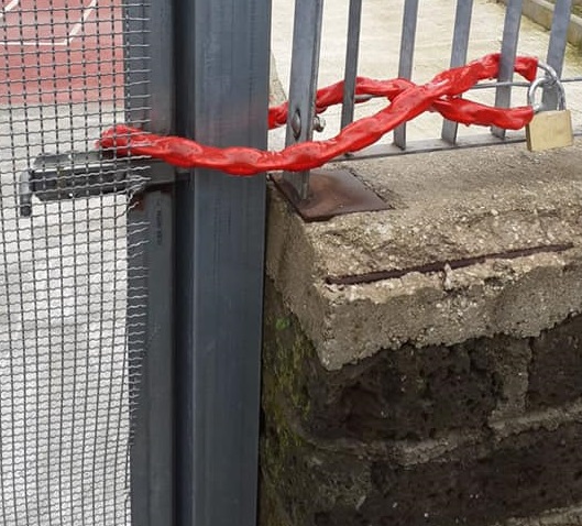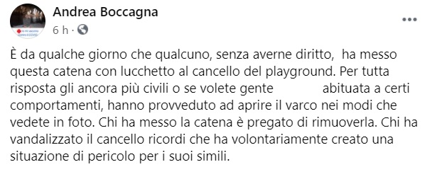 "È da qualche giorno che qualcuno, senza averne diritto, ha messo questa catena con lucchetto al cancello del playground. Per tutta risposta gli ancora più civili o se volete gente... abituata a certi comportamenti, hanno provveduto- si legge nella nota- ad aprire il varco nei modi che vedete in foto. Chi ha messo la catena è pregato di rimuoverla. Chi ha vandalizzato il cancello ricordi che ha volontariamente creato una situazione di pericolo per i suoi simili."