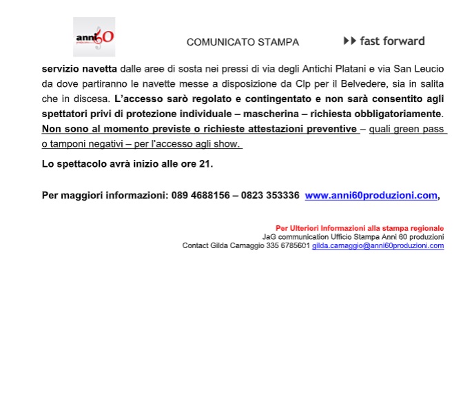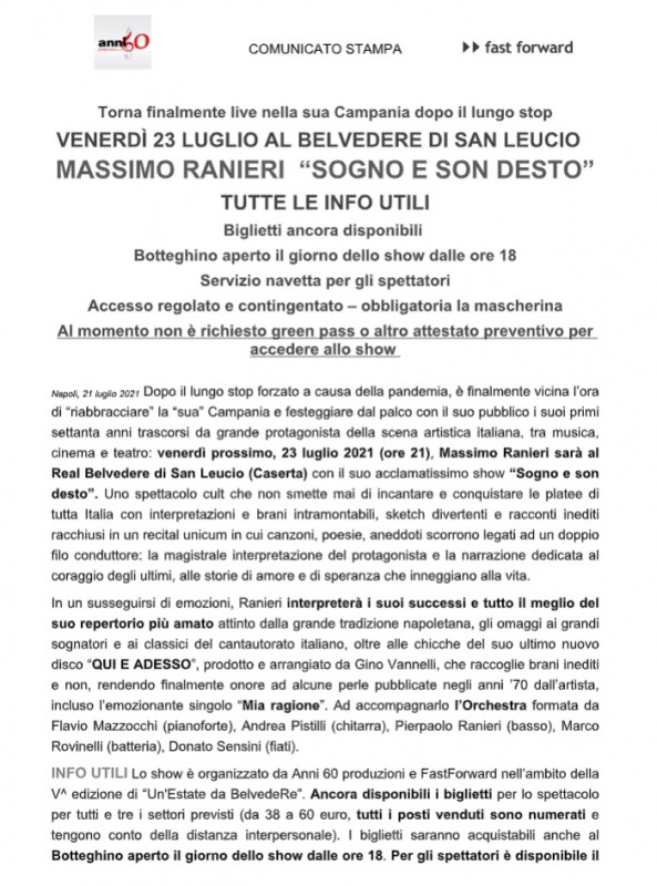"Torna finalmente live nella sua Campania dopo il lungo stop. VENERDÌ 23 LUGLIO AL BELVEDERE DI SAN LEUCIO MASSIMO RANIERI “SOGNO E SON DESTO”. TUTTE LE INFO UTILI. Biglietti ancora disponibili. Botteghino aperto il giorno dello show dalle ore 18. Servizio navetta per gli spettatori. Accesso regolato e contingentato – obbligatoria la mascherina. Al momento non è richiesto green pass o altro attestato preventivo per accedere allo show. Dopo il lungo stop forzato a causa della pandemia, è finalmente vicina l’ora di “riabbracciare”- si legge nella nota- la “sua” Campania e festeggiare dal palco con il suo pubblico i suoi primi settanta anni trascorsi da grande protagonista della scena artistica italiana, tra musica, cinema e teatro: venerdì prossimo, 23 luglio 2021 (ore 21), Massimo Ranieri sarà al Real Belvedere di San Leucio (Caserta) con il suo acclamatissimo show “Sogno e son desto”. Uno spettacolo cult che non smette mai di incantare e conquistare le platee di tutta Italia con interpretazioni e brani intramontabili, sketch divertenti e racconti inediti racchiusi in un recital unicum in cui canzoni, poesie, aneddoti scorrono legati ad un doppio filo conduttore: la magistrale interpretazione del protagonista e la narrazione dedicata al coraggio degli ultimi, alle storie di amore e di speranza che inneggiano alla vita. In un susseguirsi di emozioni, Ranieri interpreterà i suoi successi e tutto il meglio del suo repertorio più amato attinto dalla grande tradizione napoletana, gli omaggi ai grandi sognatori e- si legge nella nota- ai classici del cantautorato italiano, oltre alle chicche del suo ultimo nuovo disco “QUI E ADESSO”, prodotto e arrangiato da Gino Vannelli, che raccoglie brani inediti e non, rendendo finalmente onore ad alcune perle pubblicate negli anni ’70 dall’artista, incluso l’emozionante singolo “Mia ragione”. Ad accompagnarlo l’Orchestra formata da Flavio Mazzocchi (pianoforte), Andrea Pistilli (chitarra), Pierpaolo Ranieri (basso), Marco Rovinelli (batteria), Donato Sensini (fiati). INFO UTILI Lo show è organizzato da Anni 60 produzioni e FastForward nell’ambito della V^ edizione di “Un'Estate da BelvedeRe”. Ancora disponibili i biglietti per lo spettacolo per tutti e tre i settori previsti (da 38 a 60 euro, tutti i posti venduti sono numerati e tengono conto della distanza interpersonale). I biglietti saranno acquistabili anche al Botteghino aperto il giorno dello show dalle ore 18. Per gli spettatori è disponibile il COMUNICATO STAMPA servizio navetta dalle aree di sosta nei pressi di via degli Antichi Platani e via San Leucio da dove partiranno le navette messe a disposizione da Clp per il Belvedere, sia in salita che in discesa. L’accesso sarò regolato e contingentato e non sarà consentito agli spettatori privi di protezione individuale – mascherina – richiesta obbligatoriamente. Non sono al momento previste o richieste attestazioni preventive – quali green pass o tamponi negativi – per l’accesso agli show. Lo spettacolo- si legge nella nota- avrà inizio alle ore 21. Per maggiori informazioni: 089 4688156 – 0823 353336 www.anni60produzioni.com"