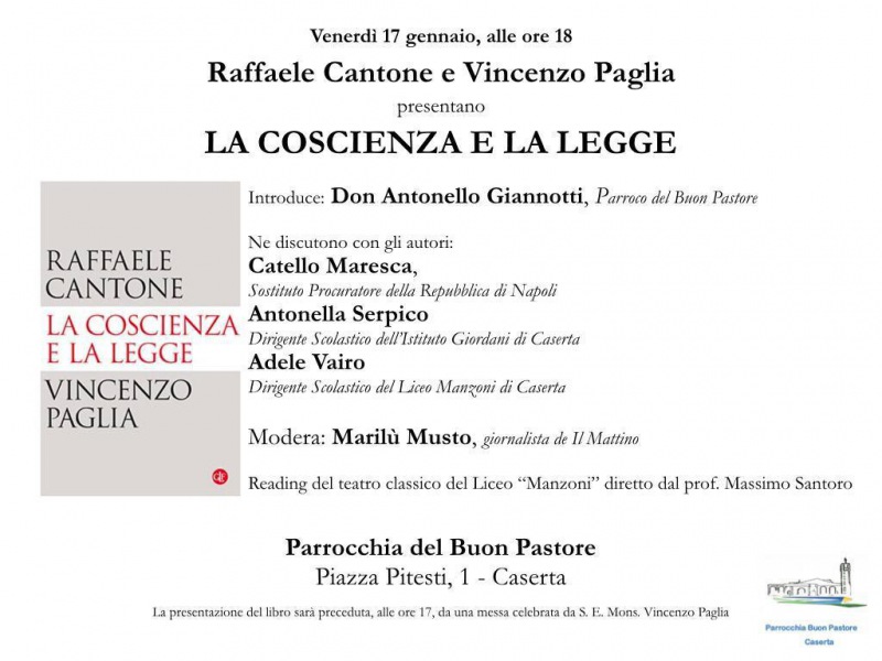 Venerdi 17 gennaio alle ore 18 ci sarà la presetazione del libro "La coscienza e la legge" di Raffaele Cantone e Vincenzo Paglia alla Parrocchia del Buon Pastore a Caserta. L'appuntamento sarà introdotto da Don Antonello Giannotti e preceduto, alle ore 17, da una messa celebrativa.