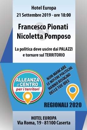 Sabato prima uscita ufficiale a Caserta per Alleanza di Centro per i Territori la nuova formazione politica che si presentera' anche alle prossime Regionali in Campania. Presenti il Segretario Nazionale Pionati e il Segretario Provinciale Nicoletta Pomposo.