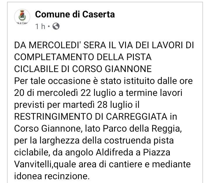 Questo quanto comunicato dal Comune di Caserta