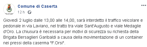 "Giovedì 2 luglio dalle 13,00 alle 14,00, sarà interdetto il traffico veicolare e pedonale in via Laviano, nel tratto tra viale Sant'Augusto e viale Medaglie d'Oro. La chiusura è necessaria per motivi di sicurezza su richiesta della Brigata Bersaglieri Garibaldi a causa della movimentazione di un container nei pressi della caserma "F.Orsi"."