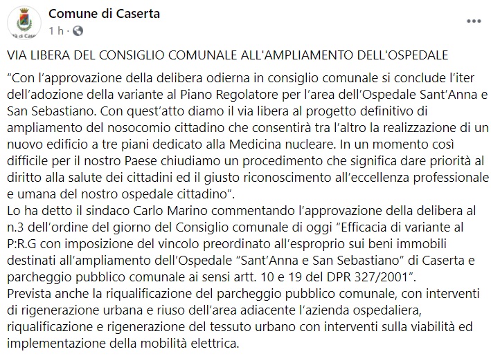 Questo quanto pubblicato sulla pagina fb del Comune di Caserta: "VIA LIBERA DEL CONSIGLIO COMUNALE ALL'AMPLIAMENTO DELL'OSPEDALE “Con l’approvazione della delibera odierna in consiglio comunale si conclude l’iter dell’adozione della variante al Piano Regolatore - si legge nella nota - per l’area dell’Ospedale Sant’Anna e San Sebastiano. Con quest’atto diamo il via libera al progetto definitivo di ampliamento del nosocomio cittadino che consentirà tra l’altro la realizzazione di un nuovo edificio a tre piani dedicato alla Medicina nucleare. In un momento così difficile per il nostro Paese chiudiamo un procedimento che significa dare priorità al diritto alla salute dei cittadini ed il giusto riconoscimento all’eccellenza professionale e umana del nostro ospedale cittadino”. Lo ha detto il sindaco Carlo Marino - si legge nella nota - commentando l’approvazione della delibera al n.3 dell’ordine del giorno del Consiglio comunale di oggi “Efficacia di variante al P:R.G con imposizione del vincolo preordinato all’esproprio sui beni immobili destinati all’ampliamento dell’Ospedale “Sant’Anna e San Sebastiano” di Caserta e parcheggio pubblico comunale ai sensi artt. 10 e 19 del DPR 327/2001”. Prevista anche la riqualificazione del parcheggio pubblico comunale, con interventi di rigenerazione urbana e riuso dell’area adiacente l’azienda ospedaliera, riqualificazione e rigenerazione - si legge nella nota - del tessuto urbano con interventi sulla viabilità ed implementazione della mobilità elettrica."
