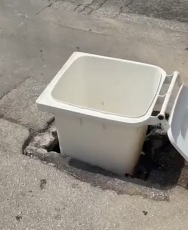Proseguono i lavori ordinati dall'amministrazione Marino per riasfaltare la strada ed anche per migliorare i sottoservizi. Ma c'e' una 'novita' rappresentata da questo bidone dell'immondizia che copre una buca o un tombino scoperto. Certamente questo non era previsto o almeno lo speriamo. Tra l'altro la presenza di questo bidone limita la circolazione.