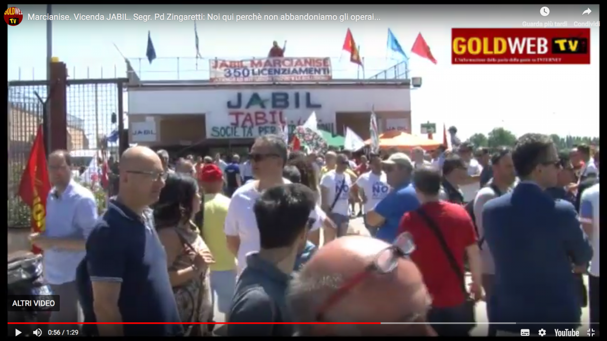 E' nota a tutti la vicenda JABIL. Rischiano infatti il posto circa 350 dipendenti. E domani mattina "in riferimento - si legge nella nota di CGIL-CISL-UILM- alle iniziative di contrasto agli annunciati licenziamenti della Società Jabil Circuit di Marcianise, il giorno 5 Luglio 2019 ci sarà un presidio di circa 300 lavoratori nella piazza Vanvitelli, antistante la Prefettura dalle ore 9".