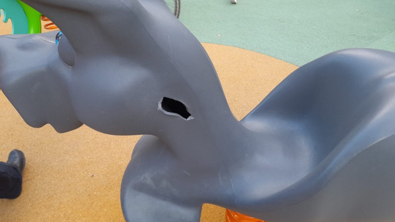 E' stata immediatamente rimossa dal Comune di Caserta l'altalena circolare danneggiata, ora, immaginiamo in riparazione, presso il Parco giochi di piazza Padre Pio a Caserta. Oggi vi segnaliamo il danneggiamento di uno degli animali che dondolano in mezzo al parco sempre piu' frequentato dai bambini. Come potete vedere un asino è rimasto senza una maniglia, il che rende complicata la fruizione ai bimbi.