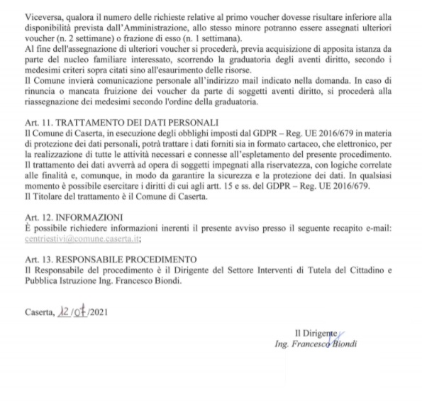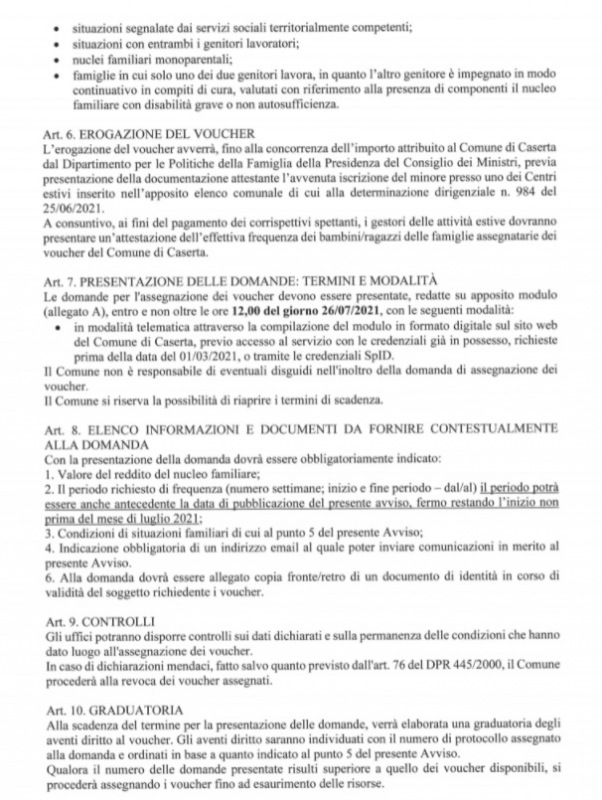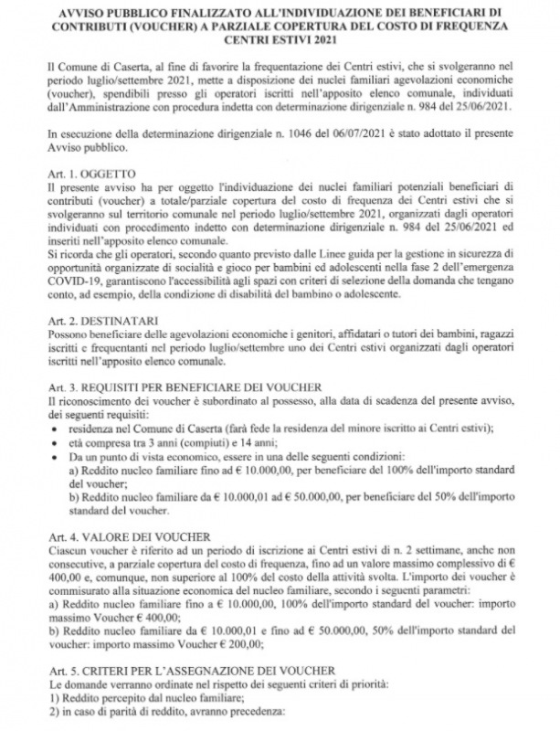Questo quanto comunicato dal Comune di Caserta: "AVVISO PUBBLICO FINALIZZATO ALL'INDIVIDUAZIONE DEI BENEFICIARI DI CONTRIBUTI (VOUCHER) A PARZIALE COPERTURA DEL COSTO DI FREQUENZA CENTRI ESTIVI 2021