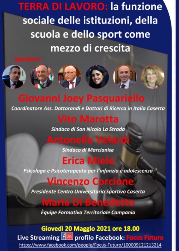 Giovedì 20 maggio 2021 h 18:00, si terrà il webinar dal titolo: “TERRA DI LAVORO: la funzione sociale delle istituzioni, della scuola e dello sport come mezzo di crescita”. Un’occasione per guardare con fiducia agli scenari post Covid - si legge nella nota - e dare un contributo per valorizzare il nostro territorio. Interverranno all’incontro interattivo: Giovanni Joey Pasquariello (Dottore di Ricerca - Coordinatore Associazione Dottorandi e Dottori di Ricerca in Italia Caserta), Vito Marotta (Sindaco di San Nicola La Strada), Antonello Velardi (Sindaco di Marcianise), Erica Miele (Psicologa e Psicoterapeuta per l’infanzia e adolescenza), Vincenzo Corcione (Presidente Centro Universitario Sportivo Caserta), Maria Di Benedetto (Èquipe Formativa Territoriale Campania). Il processo di ripartenza post-covid non può prescindere dal mettere al centro il sistema educativo, le istituzioni, lo sport, la ricerca; bisogna fare rete. In questo momento particolare - si legge nella nota - in cui si è distanti fisicamente, si è uniti nello spirito e, insieme, si cercherà di ripartire rivalutando l’aggregazione giovanile, la cultura, il lavoro e il territorio. L’inizio dei lavori del webinar è fissato alle 18:00, live Streaming Facebook CLICCA QUI (il webinar è gratuito e non c’è bisogno di registrarsi). Comitato organizzativo: Dr. Joey Pasquariello e Dr. Giuseppe Porzio."