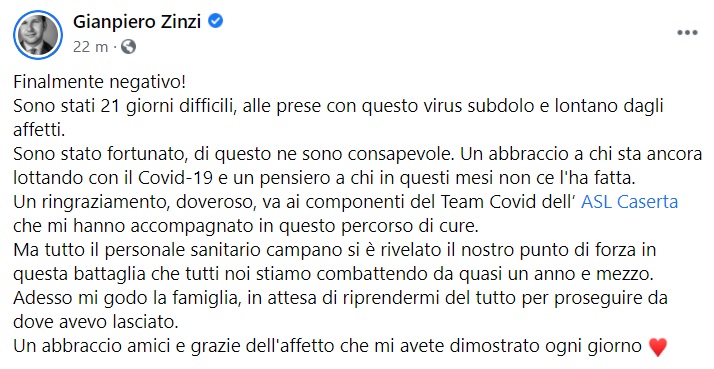 "Finalmente negativo! Sono stati 21 giorni difficili, alle prese con questo virus subdolo e lontano dagli affetti. Sono stato fortunato, di questo ne sono consapevole. Un abbraccio a chi sta ancora lottando con il Covid-19 e- si legge nella nota- un pensiero a chi in questi mesi non ce l'ha fatta. Un ringraziamento, doveroso, va ai componenti del Team Covid dell’ ASL Caserta che mi hanno accompagnato in questo percorso di cure. Ma tutto il personale sanitario campano si è rivelato il nostro punto di forza in questa battaglia che tutti noi stiamo combattendo da quasi un anno e mezzo. Adesso mi godo la famiglia, in attesa di riprendermi del tutto per proseguire- si legge nella nota- da dove avevo lasciato. Un abbraccio amici e grazie dell'affetto che mi avete dimostrato ogni giorno"