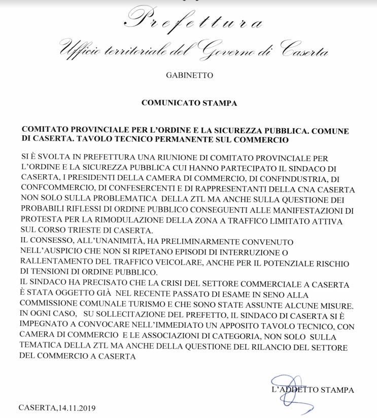 Pubblichiamo nota stampa della Prefettura di Caserta: