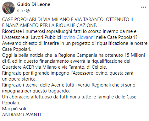 Questo il post pubblicato sulla sua pagina Facebook dal Sindaco di Cellole Guido Di Leone: "CASE POPOLARI DI VIA MILANO E VIA TARANTO: OTTENUTO IL FINANZIAMENTO PER LA RIQUALIFICAZIONE. Ricordate i numerosi sopralluoghi fatti lo scorso inverno da me e l’Assessore ai Lavori Pubblici Iovino Giovanni nelle Case Popolari? Avevamo chiesto - si legge nel post - di inserire in un progetto di riqualificazione le nostre Case Popolari. Oggi la bella notizia che la Regione Campania ha ottenuto 15 Milioni di €, ed in questo finanziamento avverrà la riqualificazione del Quartiere ACER via Milano e via Taranto, di Cellole. Ringrazio - prosegue il post - per il grande impegno l’Assessore Iovino, questa sarà un’opera storica. Ringrazio i tecnici delle Acer e tutti i vertici Regionali che si sono impegnati per questo traguardo. Un abbraccio affettuoso da tutti noi - conclude il post - a tutte le famiglie delle Case Popolari. Mai più soli. ANDIAMO AVANTI".