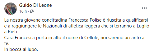Questo il post pubblicato dal Sindaco di Cellole Guido Di Leone sulla sua pagina Facebook: "La nostra giovane concittadina Francesca Polise è riuscita a qualificarsi e a raggiungere le Nazionali di atletica leggera che si terranno a Luglio a Rieti. Cara Francesca - si legge nel post - porta in alto il nome di Cellole, noi saremo accanto a te. In bocca al lupo".