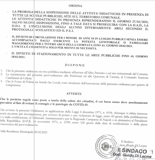 E' di oggi l'ordinanza n. 28 del 2020 emanata dal Comune di Cellole che prevede la proroga della sospensione delle attività didattiche in presenza fino al 27 febbraio in tutte le scuole del territorio comunale. Con la stessa ordinanza il Sindaco Di Leone ha disposto il divieto di circolazione per i minori di anni 18 in luoghi pubblici senza essere accompagnati fino al giorno 28/2/2020 ed il divieto di stazionamento in tutte le aree pubbliche fino alla stessa data. Per leggere l'ordinanza clicca qui.