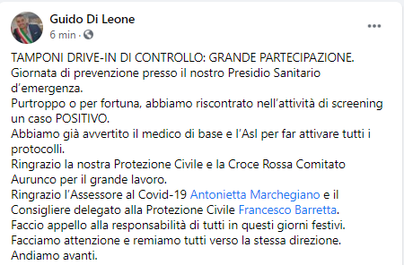 Questo il post pubblicato dal Sindaco di Cellole Guido Di Leone sulla sua pagina Facebook: "Tamponi drive-in di controllo: grande partecipazione. Giornata di prevenzione presso il nostro Presidio Sanitario d’emergenza. Purtroppo o per fortuna - si legge nel post - abbiamo riscontrato nell’attività di screening un caso positivo. Abbiamo già avvertito il medico di base e l’Asl per far attivare tutti i protocolli. Ringrazio la nostra Protezione Civile e la Croce Rossa Comitato Aurunco per il grande lavoro. Ringrazio l’Assessore al Covid-19 Antonietta Marcegiano e il Consigliere delegato alla Protezione Civile Francesco Barretta. Faccio appello alla responsabilità di tutti in questi giorni festivi. Facciamo attenzione - conclude il post - e remiamo tutti verso la stessa direzione. Andiamo avanti".