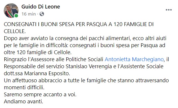 "CONSEGNATI I BUONI SPESA PER PASQUA A 120 FAMIGLIE DI CELLOLE. Dopo aver avviato la consegna dei pacchi alimentari, ecco altri aiuti per le famiglie in difficoltà: consegnati i buoni spesa per Pasqua ad oltre 120 famiglie di Cellole. Ringrazio- si legge nella nota- l’Assessore alle Politiche Sociali Antonietta Marchegiano, il Responsabile del servizio Stanislao Verrengia e l’Assistente Sociale dott.ssa Marianna Esposito. Un affettuoso abbraccio a tutte le famiglie che stanno attraversando momenti difficili. Saremo sempre accanto a voi. Andiamo avanti."